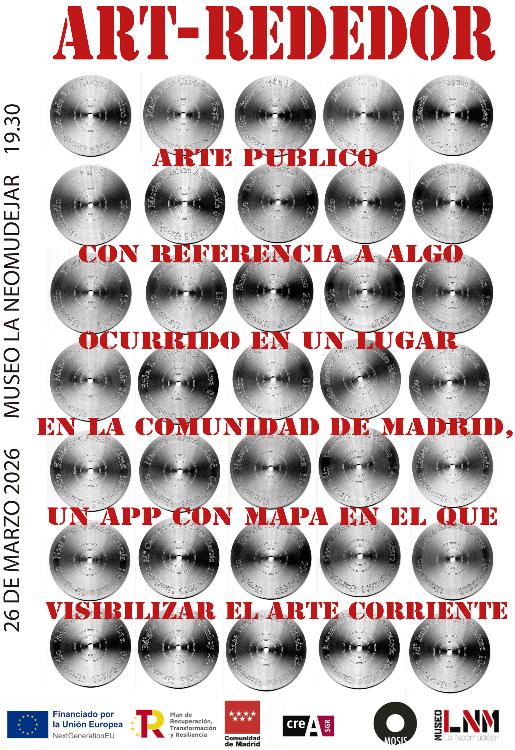 Volvemos al proyecto de “arte corriente urbano” y presentamos una obra física, la placa vida del Colectivo Constancia. A diferencia de los ladrillos de memoria de Gunter Demnig que hace adoquines dorados que resaltan sobre las aceras, tienen brillo y son permanentes, las placas vida son plateadas, copian la estética del mobiliario urbano buscando pasar desapercibidas, son instalaciones no permanentes que no alteran lo construido y no tienen autoría directa. El objetivo de este colectivo es dejar constancia de la realidad, de ahí su nombre. No ofrecen rastros de sus acciones y no se pueden ver en los medios ni redes sociales; de ahí que aquí no se presenten fotos y estas se vean solo el día de este evento proyectadas. Estas esculturas apoyan el contenido MAP (Mapa de las Asesinadas por sus Parejas) del App Art-rededor y quiere incluir en la memoria las víctimas de las violencias individuales para considerar la historia una línea continua y no una cuerda con nudos o eventos monumentales.