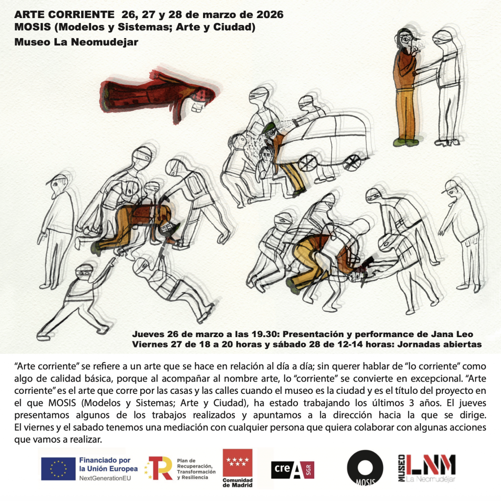 “Arte corriente” se refiere a un arte que se hace en relación al día a día; sin querer hablar de “lo corriente” como algo de calidad básica, porque al acompañar al nombre arte, lo “corriente” se convierte en excepcional. “Arte corriente” es el arte que corre por las casas y las calles cuando el museo es la ciudad y es el título del proyecto en el que MOSIS (Modelos y Sistemas; Arte y Ciudad), ha estado trabajando los últimos 3 años. En esta ocasión presentamos algunos de los trabajos realizados y apuntamos a la dirección hacia la que se dirige.