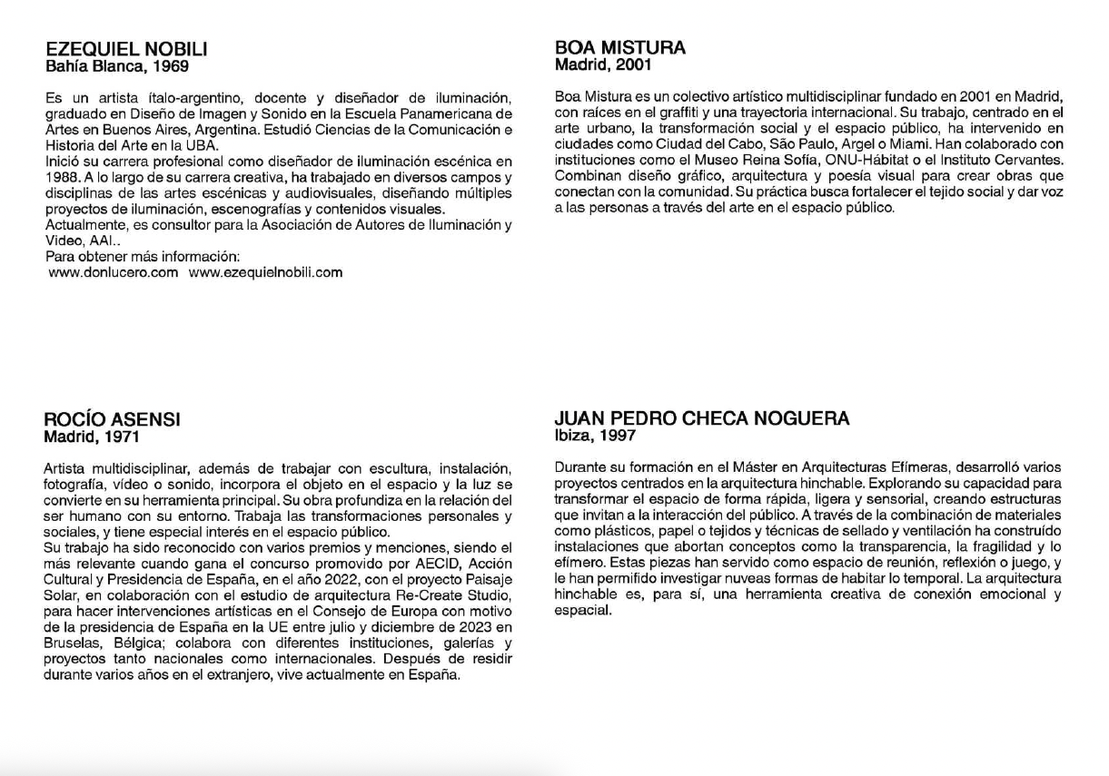 A través de la mirada plural de parte de su profesorado, del compromiso activo del alumnado y con el apoyo del Museo La Neomudéjar, se presenta una selección de proyectos, testimonios audiovisuales, investigaciones y acciones que reflejan la riqueza y diversidad de los campos abordados por las Arquitecturas e Instalaciones Efímeras e Interactivas.