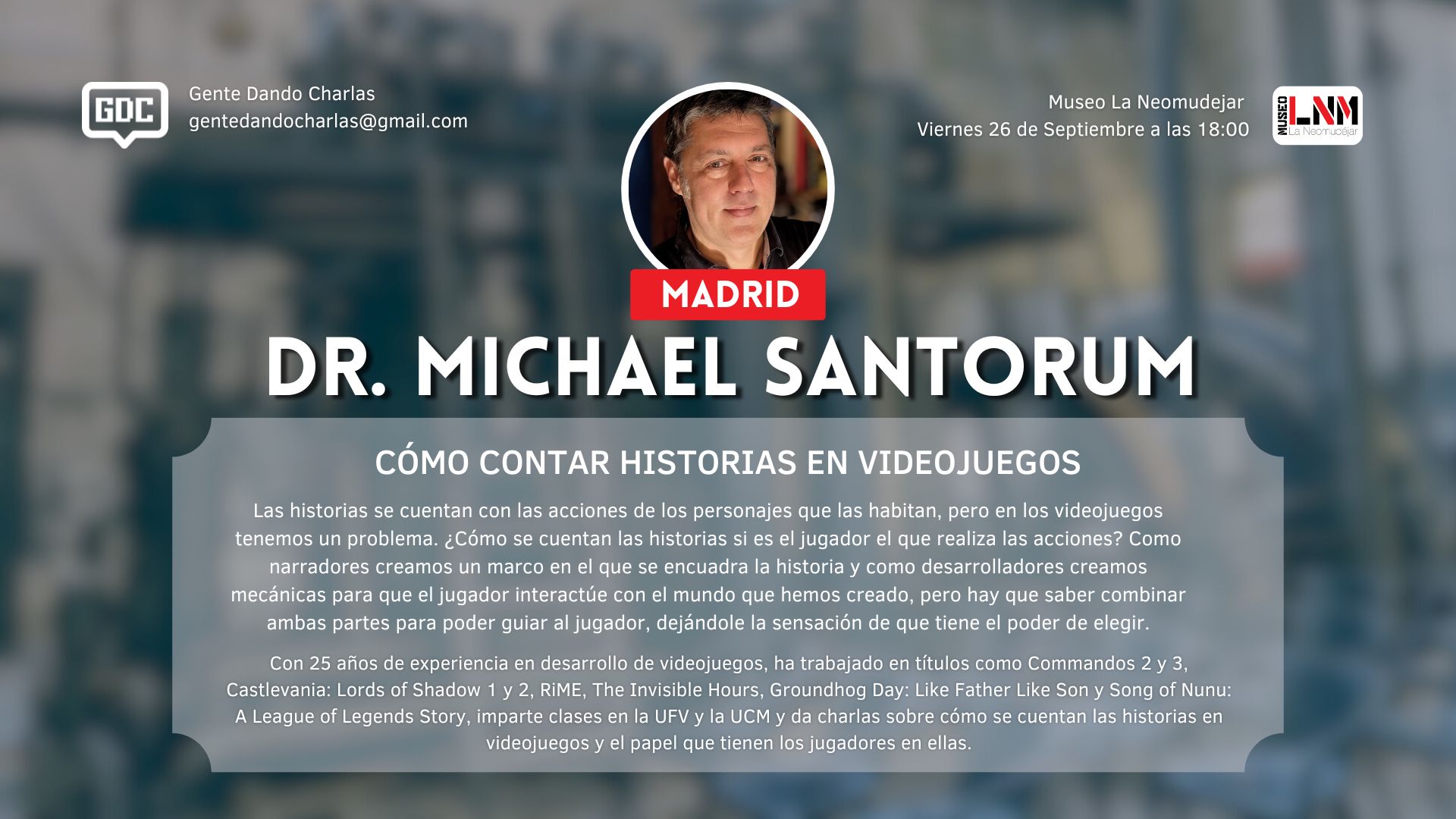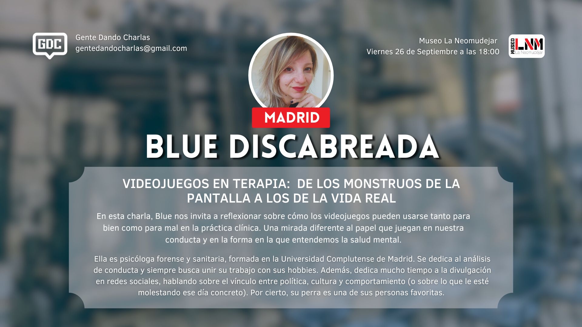 Gente Dando Charlas» (GDC) es un evento originario de Madrid donde personas, tanto desarrolladores independientes de videojuegos, personas de la industria como público en general, comparten conocimientos sobre videojuegos y otros temas culturales sociales y actuales. Su objetivo es crear un espacio inclusivo para debatir sobre las diversas facetas de la cultura del videojuego, abarcando desde aspectos técnicos hasta reflexiones críticas sociales, narrativas y la realidad de la industria.