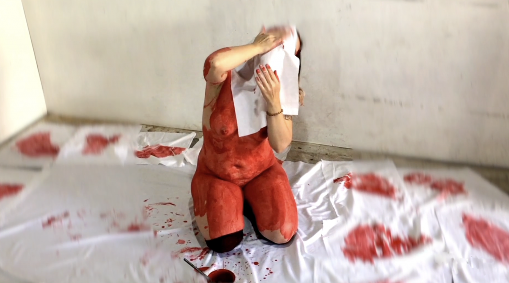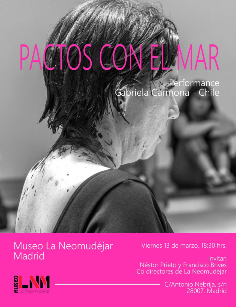 Como acertadamente ha indicado Hernán Pacurucu, la estética de Víctor Hugo Bravo trata de seducirnos con lo abyecto, pero también hace visible una estrategia de cuestionamiento de los símbolos “sublimes”, por ejemplo, de los emblemas patrióticos. El imaginario anarquizante de este artista “hace justicia” al Estado de las Cosas. Habría que pensar la obra de Víctor Hugo Bravo en el horizonte la crítica de la violencia benjaminiana. Por su parte, las acciones de Gabriela Carmona Slier suponen, en todo momento, una intensa implicación corporal e incluso un radical “desnudamiento” en el que no se busca una “erotización” sino la manifestación, simultánea, de la vulnerabilidad y del coraje. En la performance que plantea en la Neomudéjar, titulada Pactos con el mar, implica la ritualidad, la memoria y la experiencia de la herida. La famosa invocación beuysiana (“muestra tus heridas”), adquiere, en este caso, una dimensión personal y política en la que el cuerpo está, literalmente, manchado de rojo con todo el poder simbólico que esto implica. “La mancha roja –escribe Gabriela Carmona Slier- aparece como rastro vital, no solo es herida sino pulso, flujo, latino que recuerda lo vivido y trasmutable”. Con inequívoca perspectiva feminista, busca fluidificar el deseo, dar cuerpo voz al cuerpo sin dejarse atrapar en el patriarcal límite de la “vergüenza ajena”. La mancha no remite a la culpa ni hay un repliegue en el modo de lo que Nietzsche llamó “ideales ascéticos. El cuerpo desnudo deja rastros rojos, alusiones a la “impureza” menstrual y también al posicionamiento crítico, un proceso de “limpieza simbólica” que tiene algo de, valga la paradoja, reflexivamente catártico.