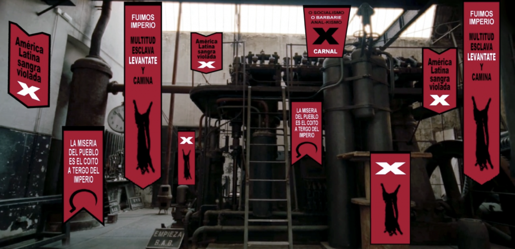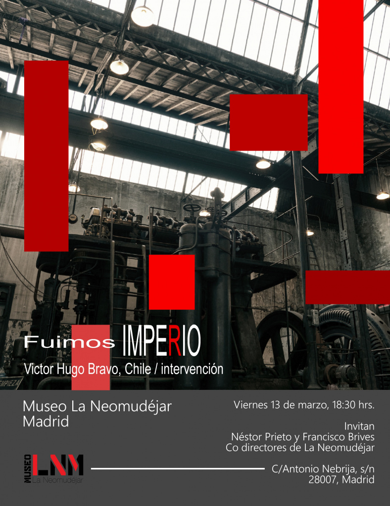 Las pulsiones somáticas de Gabriela Carmona Slier friccionan con los pendones y pancartas que Víctor Hugo Bravo dispone en esa imponente sala con enormes máquinas obsoletas de la Neomudéjar. En telas que también son de color rojo podemos leer consignas como “Fuimos Imperio. Multitud esclava. Levántate y camina”. Un imperativo imperial, imperioso improperio, por jugar con el inmemorial complejo de inferioridad de una cultura que, como advirtiera Benjamin, se entreteje con la barbarie. El artista alude a lo que denomina “la ideología muerta”, teniendo muy presente las dinámicas regresivas que imperan en Latinoamérica y (lamentablemente) en casi todo el mundo.